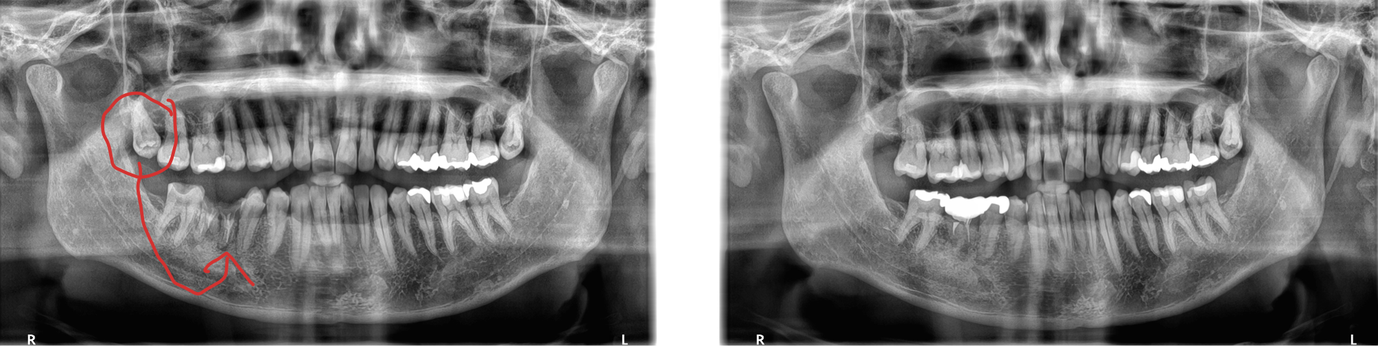 右上の親知らずを右下に移植した症例 保険適用内 歯の根のサイズが合えば適用可能